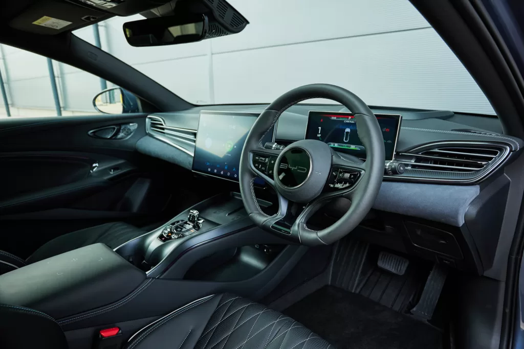 But let’s start with first impressions – which are overwhelmingly good. The BYD Seal looks every bit like an executive saloon on the inside with plenty of soft touch materials, mixing leather, chrome trim and an Alcantara-type material.