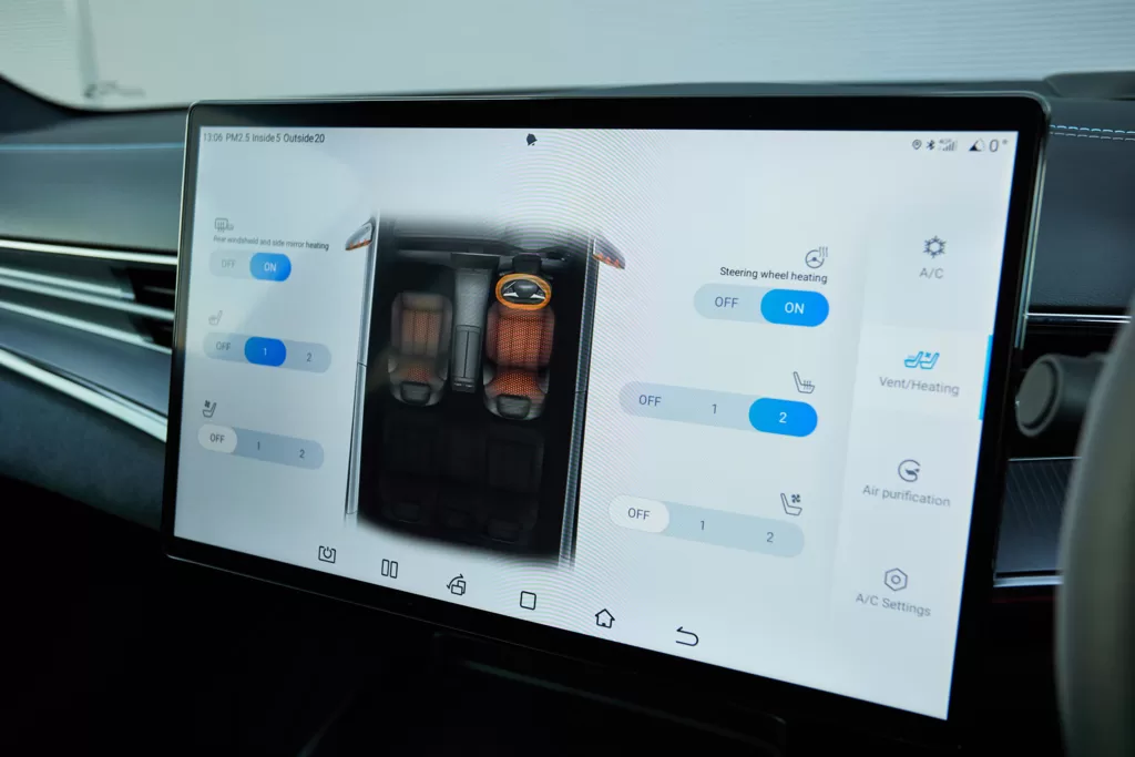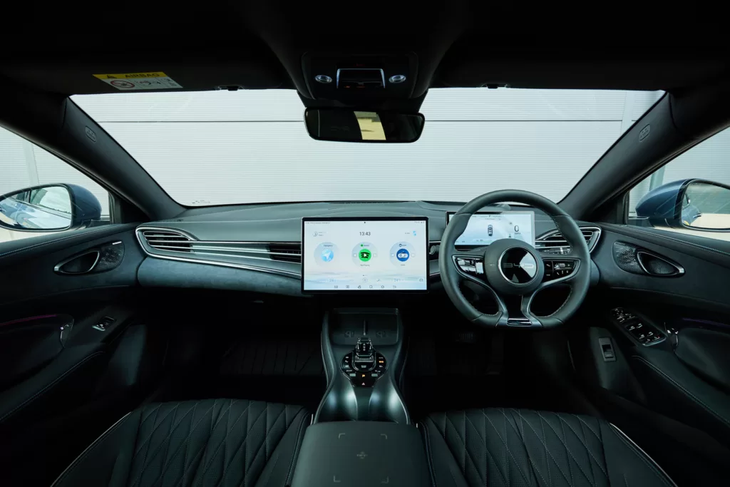 The tech available to you is impressive; from the adaptive cruise control, dual-zone air conditioning and heat pump, to the configurable mood lighting and twin wireless charging docks just below the main screen.