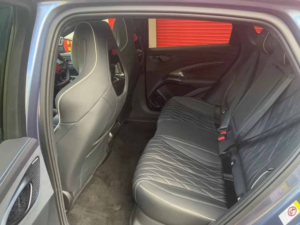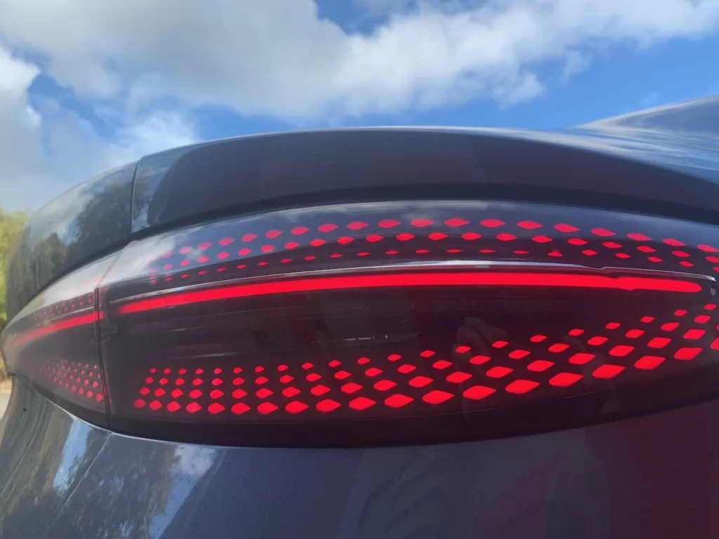 The rear end isn’t as interesting but is clean and modern with the rear lights stretched across the whole width in a viscous liquid effect, thinning out in the middle.  Some may like the deep rear diffuser, but I think it detracts somewhat from the clean look. Still; a lot better than many EVs.