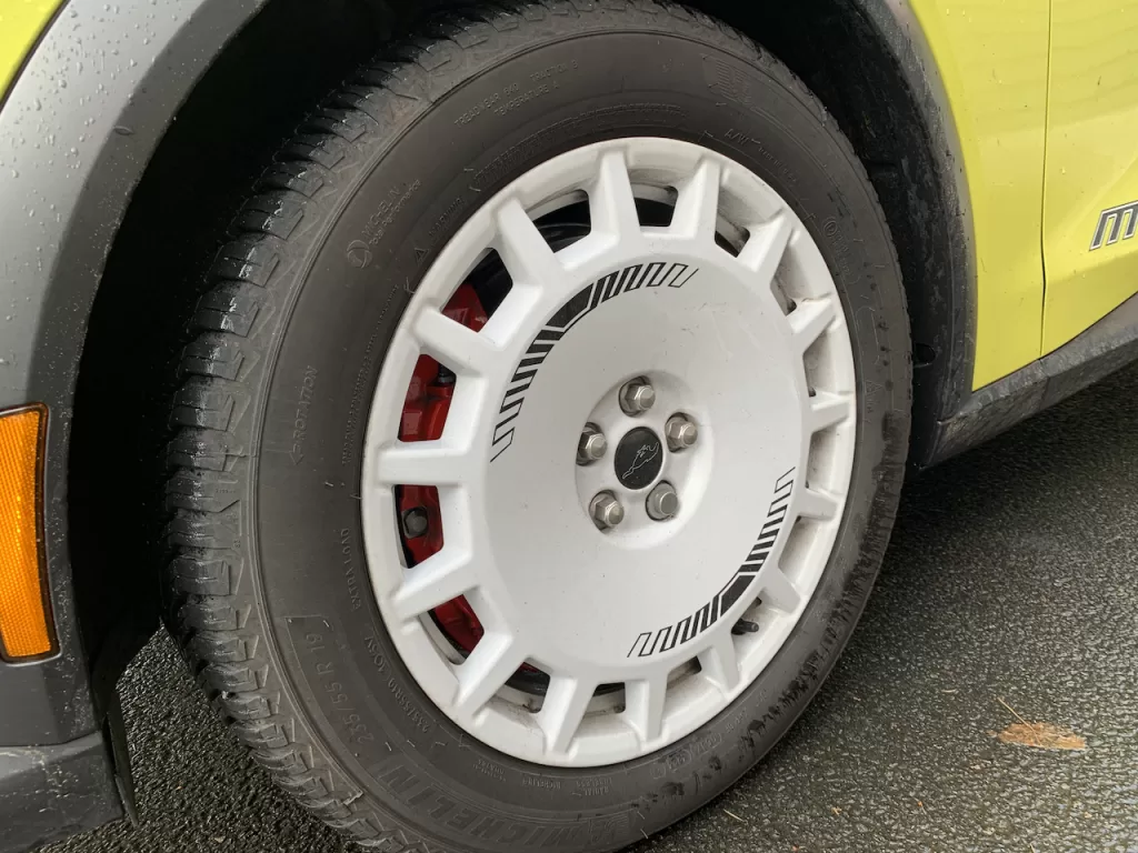 At first glance, the Mach-E Rally looks like a Mach-E that’s been hitting the gym and the trails. The 20mm suspension lift gives it a purposeful stance, while the white rally-style wheels are a cheeky nod to classic rally cars. There’s a chunky rear spoiler that wouldn’t look out of place on a WRC stage, and the front end wears extra protection for gravel rash. It’s not subtle, but that’s the point — this is an EV that wants to be noticed.