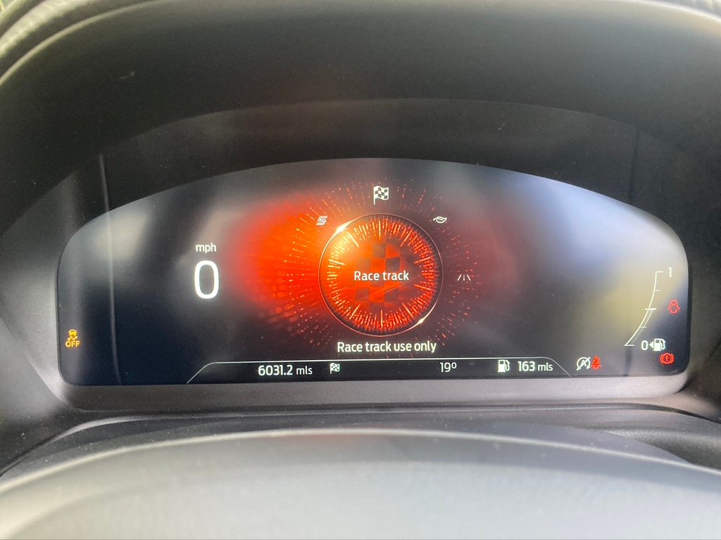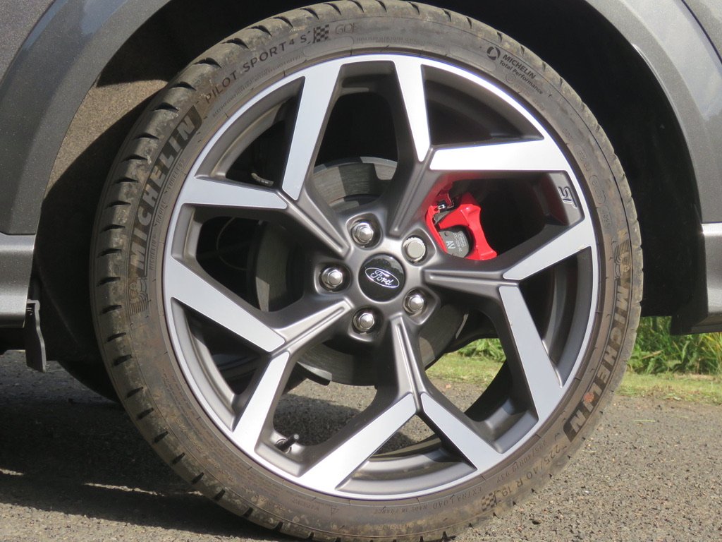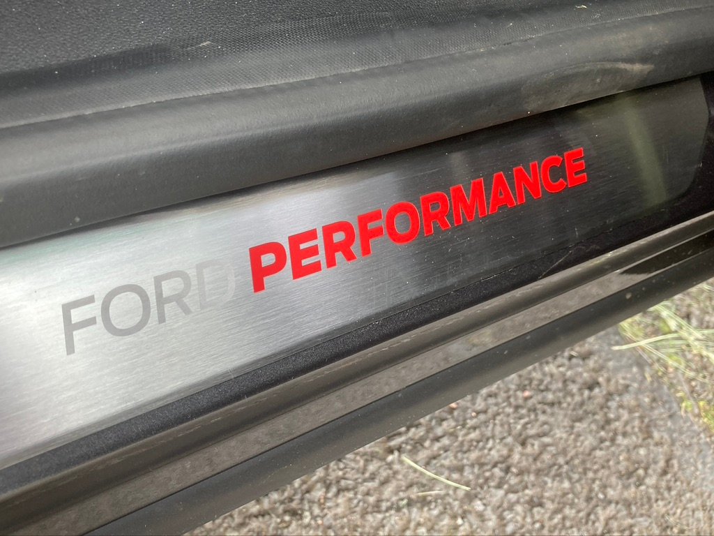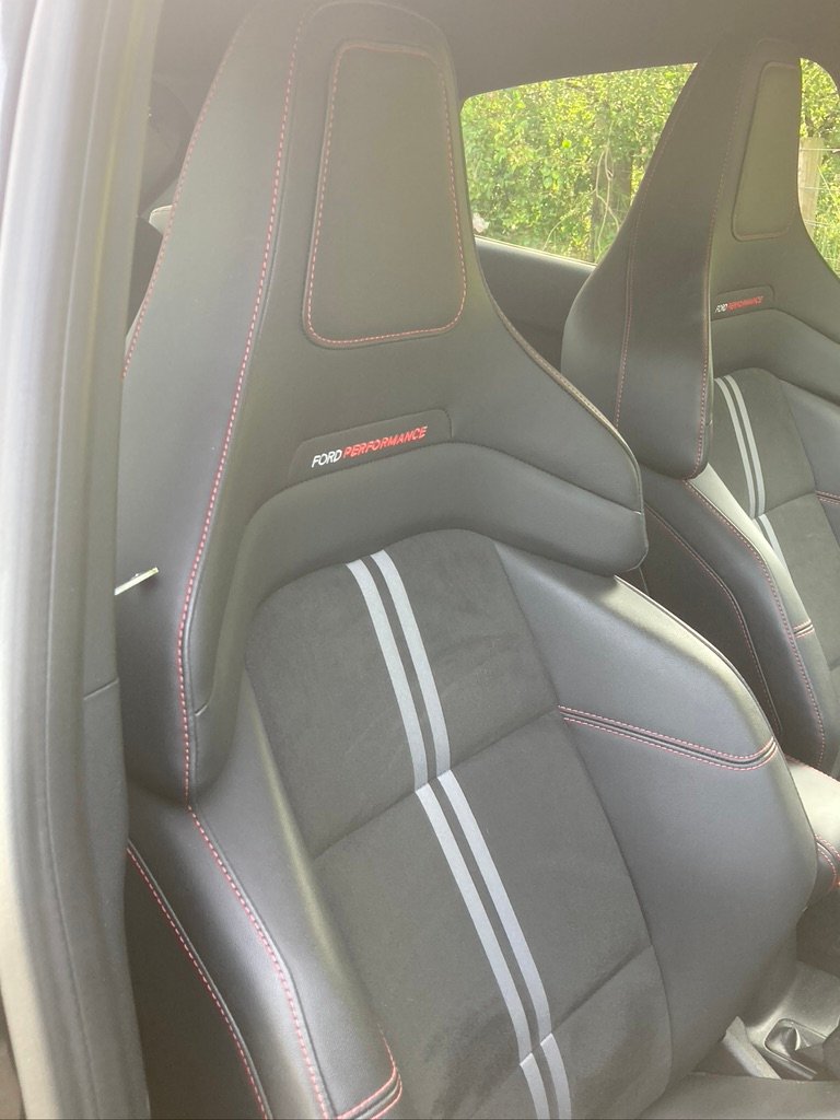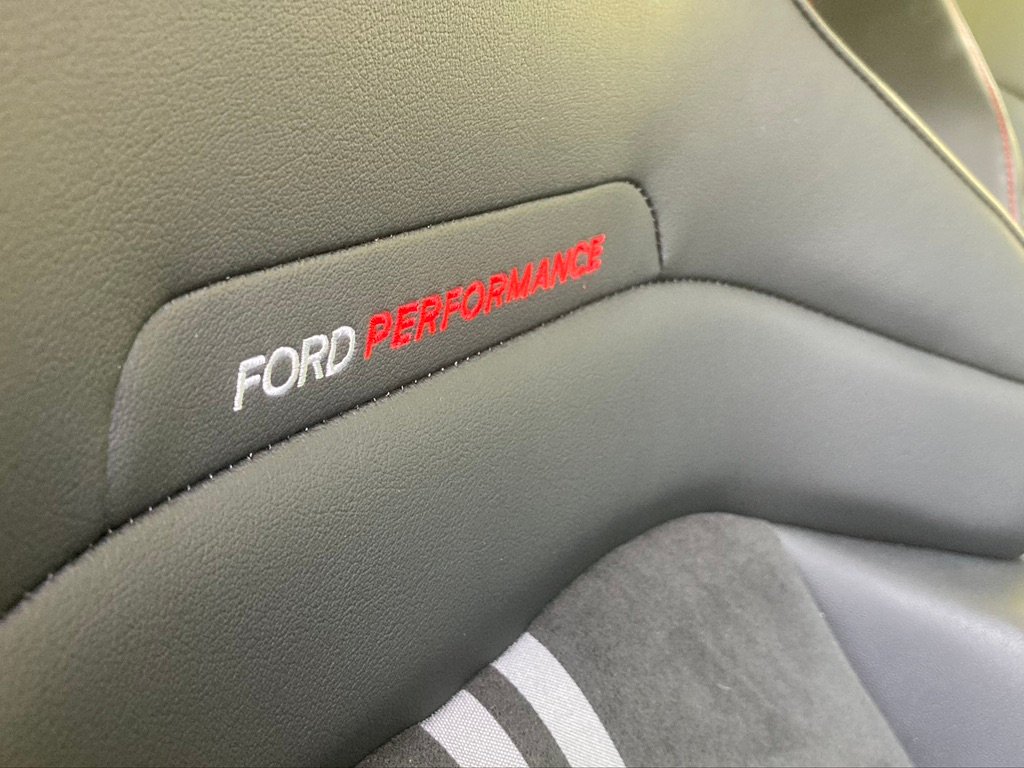 And that’s about it for choices – other than the likes of a panoramic sunroof, power tailgate and parking assistance. You can have a different style 19in alloy at no extra cost, while the interior remains a partial faux-leather with red stitching and ludicrous Batmobile-style front Recaro seats with Ford Performance stitched into the enormous head-and-shoulder rests.