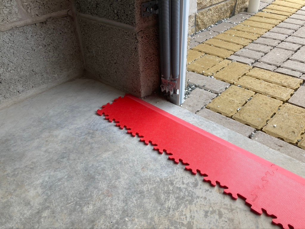 I looked online for “how-to” guidance but soon realized that for a single garage it’s simply a matter of making sure you have a centralized row running from one end of the garage to the other and the easiest way to do this was to lay the entrance ramp tiles across the opening, leaving equal-sized gaps at each end.