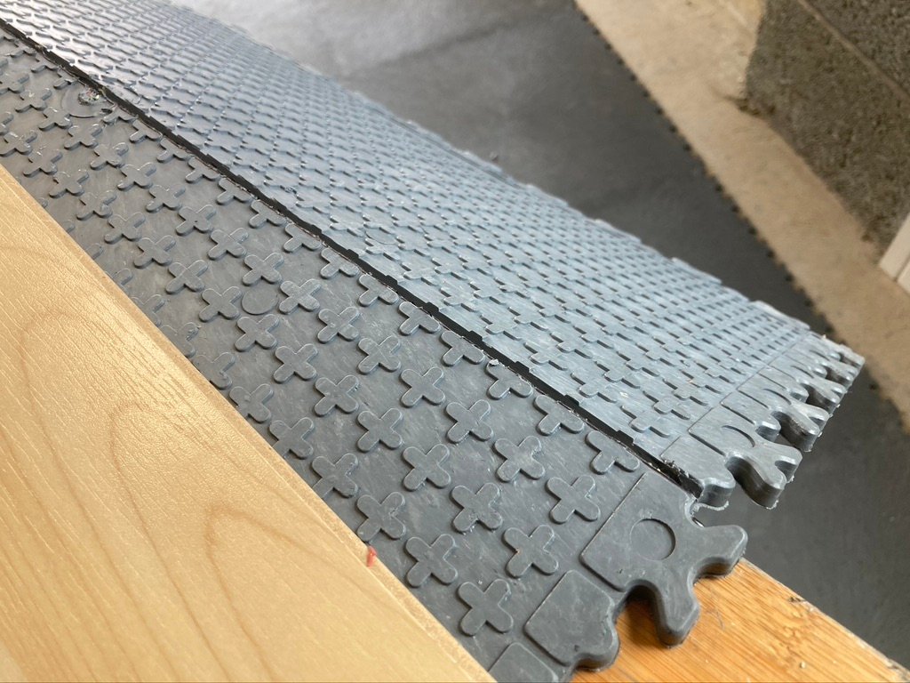 The tiles are 51cm x 51cm and 7mm thick so I knew their weight would anchor this structure in place and now it was just a matter of building out from the middle of the “T” until the whole floor was covered, leaving gaps around the perimeter.