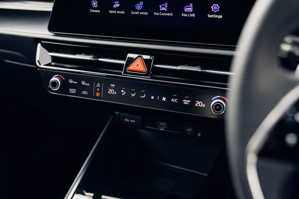 At the front, Kia’s evolving “Tiger Face” stretches across the wings, flanked by distinctive “heartbeat” daytime running lights. The profile is defined by a bold aero-focused C-pillar, which isn’t just there for drama — it actually channels airflow to boost efficiency.