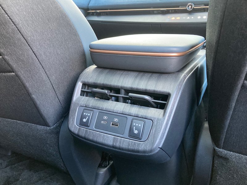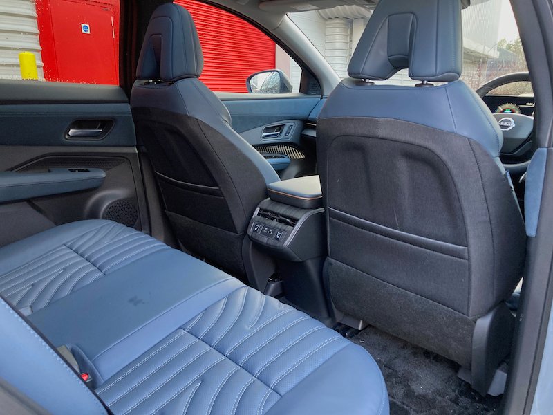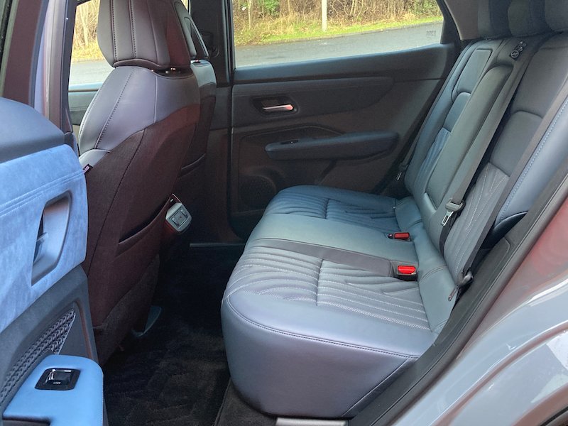The Nissan Ariya feels just as airy and spacious in the rear as it does in the front. There’s plenty of space for a 6-footer to stretch out, despite the sloping roofline, and the tall side windows and panoramic sunroof add to the feeling of space. The outer rear seats are also heated.